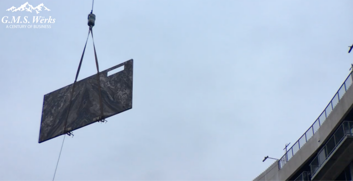 In the video you will see GMS Werks installing an island in an upper level apartment. In order to get the stone slab into the apartment, we had to use a crane and lift the stone slab up to the apartment. At GMS Werks no job is too big or too small. We ensure your custom stone selection is fabricated and installed professionally.